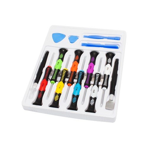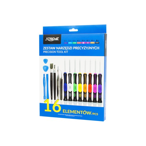 Tikslių atsuktuvų rinkinys su kitais įrankiais, skirtais įvairioms aptarnavimo užduotims. Atsuktuvai turi patogią, neslystančią rankeną.
