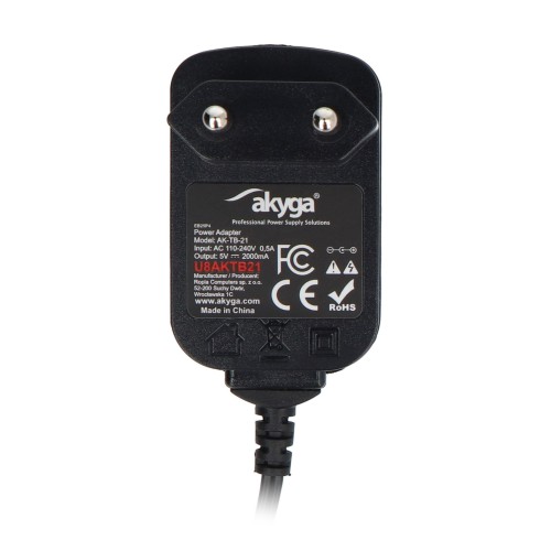 „Akyga AK-TB-21“ kintamosios srovės adapteris užtikrina stabilią 5 V / 2 A išvestį esant 10 W galiai, todėl tai idealus maitinimo šaltinis planšetiniams kompiuteriams, mini kompiuteriams ir kitiems mobiliesiems įrenginiams. Jo 2,5 / 0,7 mm kištukas ir 1,5 m laidas užtikrina patogų naudojimą. Adapteris aprūpintas įvairiomis apsaugomis (OVP, OCP, OPP, OTP, SCP), užtikrinančiomis saugų ir patikimą įrenginių įkrovimą.
