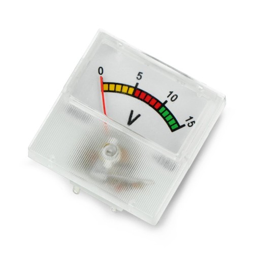 Analoginis voltmetras, galintis matuoti įtampą iki 15 V diapazone. Jis turi kvadratinį korpusą, kurio matmenys 40 x 40 mm. Jo tikslumas yra 1.5 KLASĖ.