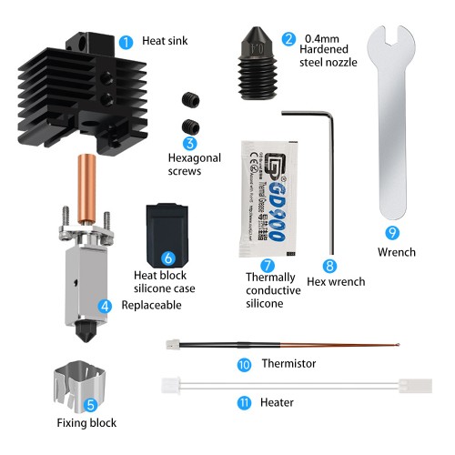 - Pakuotėje: Kiekviename komplekte yra vienas hotend surinkimas, termistorius ir keraminis šildytuvas.