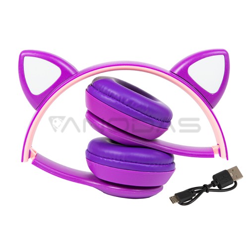 Patogios, belaidės ant ausies uždedamos ausinės vaikams. Būdingos katės ausys su LED foniniu apšvietimu išskirs jūsų vaiką iš aplinkos. Greito Bluetooth 5.0 modulio naudojimas leidžia patogiai naudotis įrenginiu (atstumas iki 10 metrų). Maitinamas iš įmontuotos baterijos. Tai puiki ir labai praktiška programėlė aktyviems žmonėms ir visiems, vertinantiems patogumą naudotis įranga.