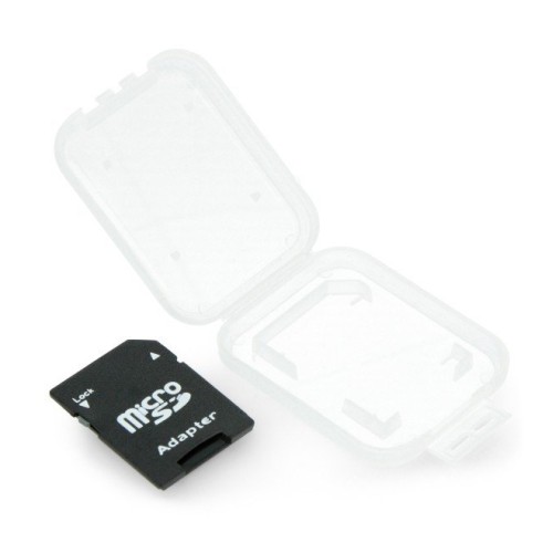 Permatoma dėžutė SD atminties kortelei su adapteriu. Atminties kortelės komplekte nėra, ją galima įsigyti atskirai. Dėžutės matmenys: 48x39x6mm.