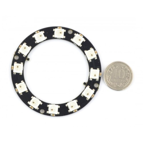 Žiedą sudaro 12 atskirai adresuotų RGB šviesos diodų su integruotu valdikliu. Moduliui reikia vieno mikrovaldiklio kaiščio, pvz. Arduino. Šviesos diodai yra išdėstyti vienodais atstumais perimetru, kurių išorinis skersmuo yra 50mm. Kiekvienas iš jų sunaudoja 18mA srovę, kuri šiuo atveju suteikia bendrą apytikslę vertę. 220mA. Žiedas gali būti maitinamas 5V įtampa. Naudojamas ryšio protokolas leidžia nuosekliai sujungti šviesos diodus. Prie išvesties jungties turėtų būti prijungta kita grandinė, atitinkamai sujungiant 5V, GND ir OUT su IN. Gamintojas pažymi, kad dirbant su daugiau nei 500 šviesos diodų, Arduino Uno sistemoje gali neužtekti RAM.