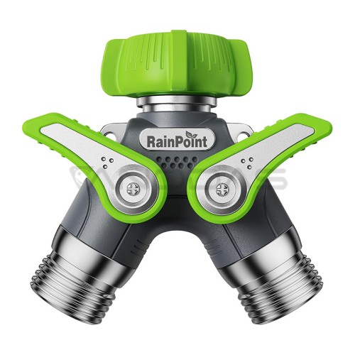 „RainPoint“ metalinis dvigubas kolektorius yra patvarus sprendimas vandens srautui padalinti į dvi nepriklausomas išleidimo angas. Jame yra pilno srauto rutuliniai vožtuvai ir 11 mm vidinis skersmuo, todėl vandens srautas padidėja 30 % (iki 30 GPM), palyginti su standartiniais kolektoriais. Konstrukcija gali atlaikyti iki 600 PSI slėgį, o 680 kg tempimo jėga garantuoja didelį mechaninį stiprumą ir ilgą tarnavimo laiką – iki 5 kartų ilgesnį nei plastikinių modelių. Tikslūs rotaciniai vožtuvai leidžia lengvai valdyti srautą kiekvienoje išleidimo angoje, o metaliniai sriegiai užtikrina patvarų ir tvirtą prijungimą prie sodo žarnų.