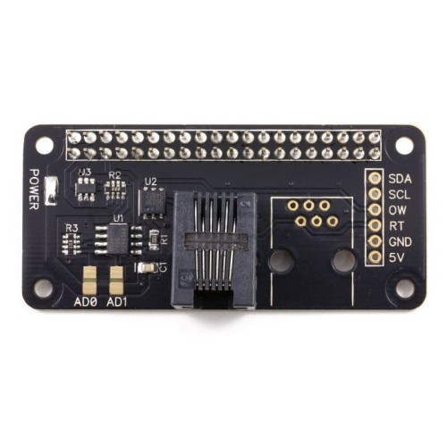 Shield for Raspberry, based on the DS2482-100 system, enabling the use of the 1-Wire protocol. The module converts to the I2C interface. It has a built-in RJ12 connector, electrostatic protection and the possibility of a separate power supply.