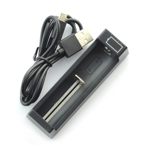 Universal mains charger for lithium-ion Li-ion cylindrical batteries. Supports battery sizes 10440, 14500, 14650, 16340, 17335, 17500, 17670, 18350, 18500, 18650, 18700, 22650, 25500 and 26650. The set also includes a power cord and a cover.