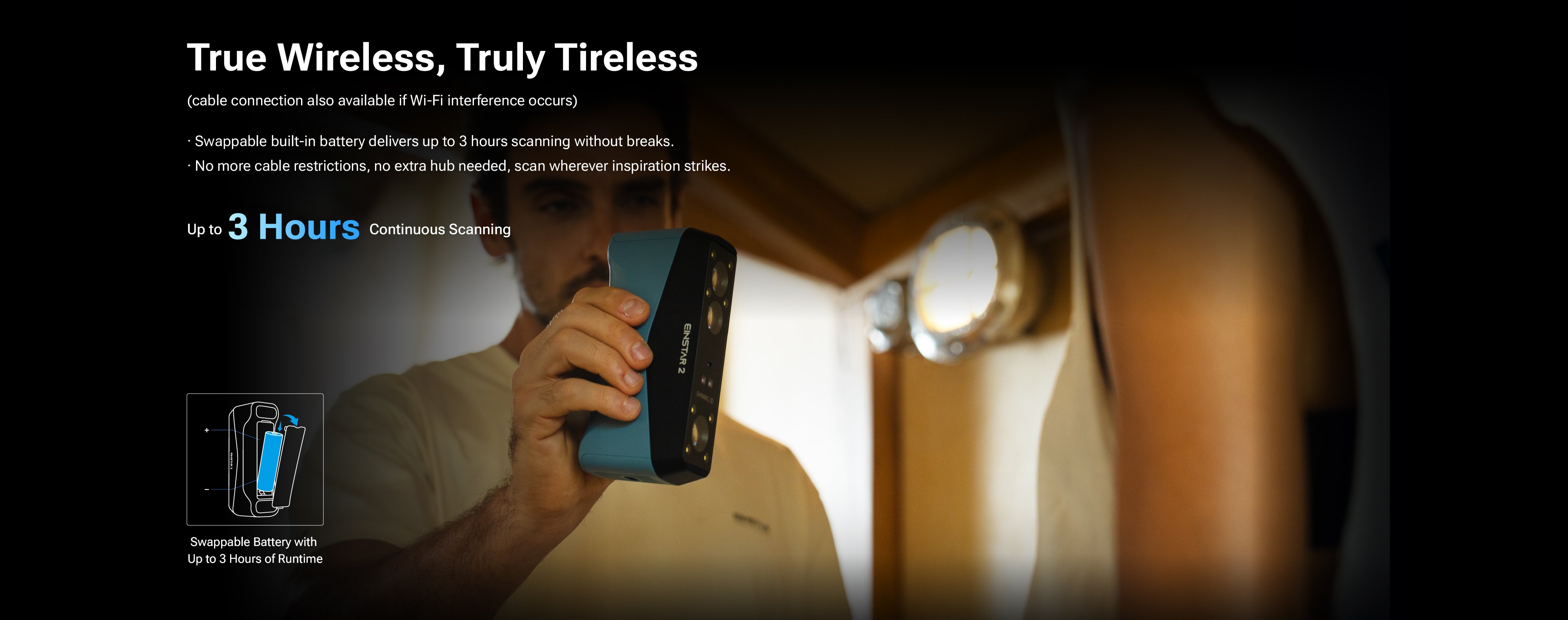 EINSTAR 2 is designed for comfortable operation. Its redesigned 420g body is comfortable to hold and easy to handle, and the replaceable built-in battery provides up to three hours of continuous scanning. No wires, no hub, no worries. Whether you're working in the studio, exploring in the field, or documenting, EINSTAR 2 gives you the freedom to create anywhere.