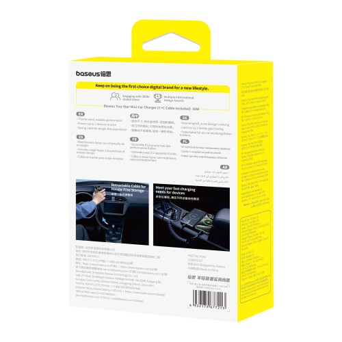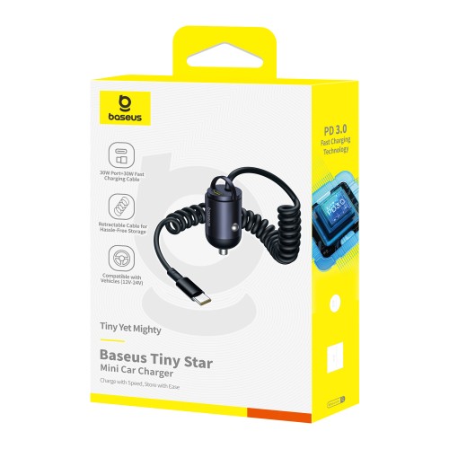 Car charger Tiny Star 30W 12-24V USB-C PD3.0 with integrated USB-C cable 30W 1.4m, black