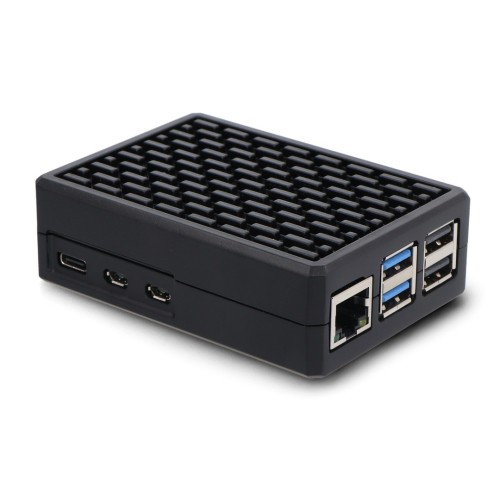 Black housing made of aluminum with dimensions 90 x 63 x 33 mm dedicated to Raspberry Pi 5. It protects the minicomputer against external factors. Precise cutouts and ventilation holes provide convenient access to ports and guarantee effective air circulation.