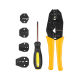 This handy set is suitable as a tool for crimping cable ends, connectors and end connections. 5 different clamping jaws can be replaced in a short time thanks to the screwdriver included in the set. The set is secured in a practical tool bag.