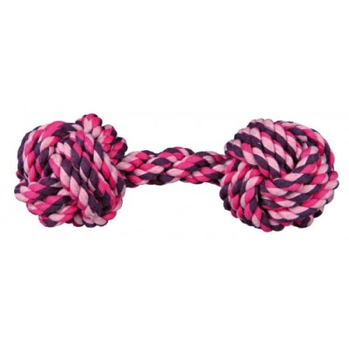 A dog toy made of cotton rope in the shape of a dumbbell.