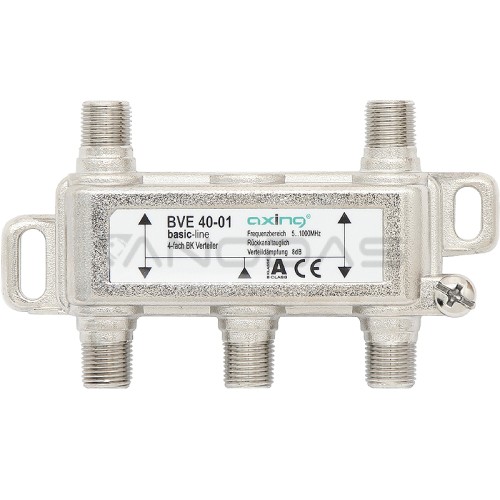Splitter with "F" sockets from the Swiss brand Axing, designed to split terrestrial and satellite TV signals from one source into four. High-quality materials used in production ensure safety of use and protection against various types of damage. The device is also characterized by good technical parameters, attention to detail and extremely simple assembly.