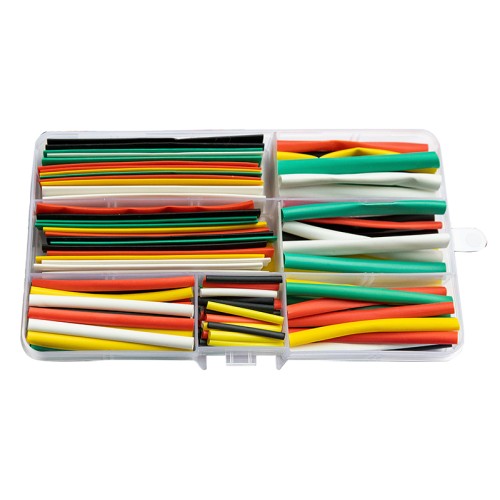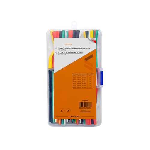 The set includes 140 pieces of sleeves. The sleeves come in 5 colors (black, white, red, green and yellow), which makes it easy to mark and then distinguish wires. They will be used primarily when creating cable insulation and electrical wire harnesses. The sleeves are made of polyolefin, which is flexible and resistant to high temperatures and anti-corrosive.