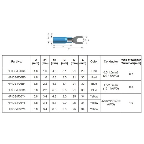 An insulated spade terminal with heat shrink sheath (M6 4-6mm2) is an electrical element used to connect large cross-section wires with other elements of the electrical system. The terminal has two branched, flat tips that allow for easy and quick connection with screw terminals, and the plastic insulation and heat-shrink sheath protect the connection against mechanical damage and the influence of the external environment. The insulated spade terminal with heat shrink sheath (M6 4-6mm2) is ideal for connections to large cables in various types of electrical devices, such as motors, transformers or industrial equipment.