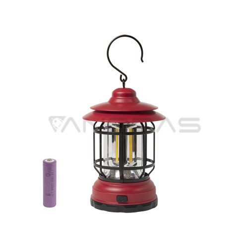 - Diodes distributed evenly around illuminate the space within 360°. The lantern is activated by a waterproof button. It has a stable stand and a hook for hanging or carrying. It is energy-saving, powered by two 18650 batteries with the possibility of charging with the new type C.