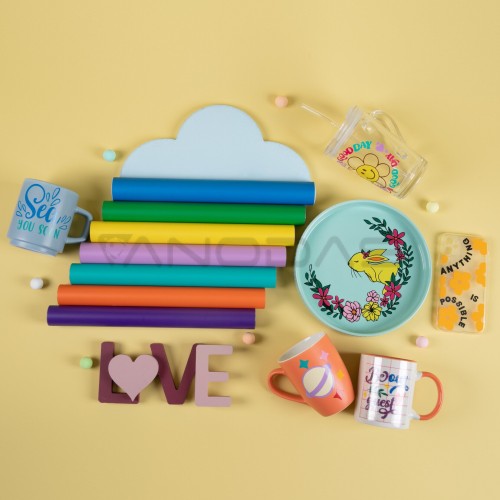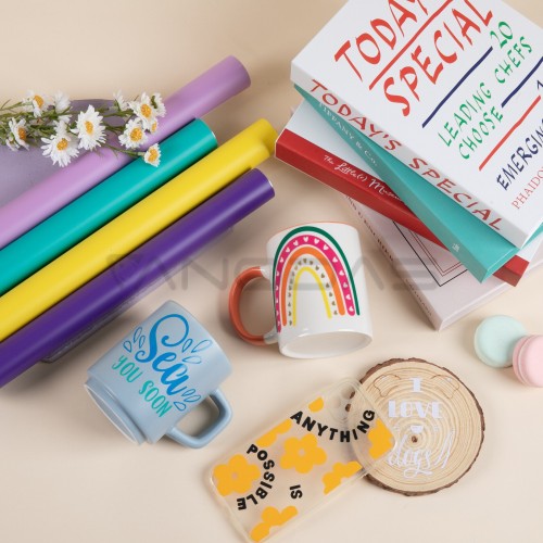 Adhesive Vinyl is one of the most popular handcraft materials. It is made up of PET and PVC. After cutting out your design with the Crafter, the adhesive vinyl easily sticks to many different surfaces like mugs, glasses, mirrors, plastic, boards, etc.