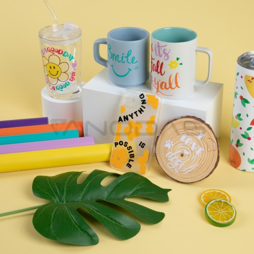 Our Adhesive Vinyl is combines with an extra-strong adhesive backing and rain-resistant layer, which can hold on tightly to any smooth surface like glass, metal, cups, mugs, desks, etc.*