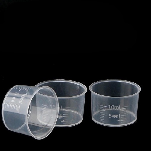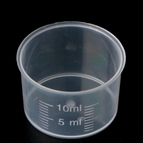 A measuring cup with a capacity of 10 ml, made of durable plastic, is an irreplaceable tool for precisely measuring small amounts of liquids or powders.
