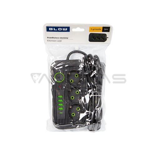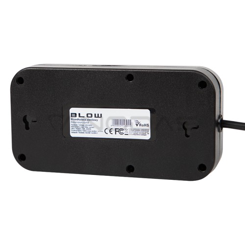 BLOW black extension cord with three sockets designed for home use. The extension cord allows you to connect devices that are far from the electrical socket. The product has 3 angled sockets and a switch on one side, and a single angled mains plug on the other.