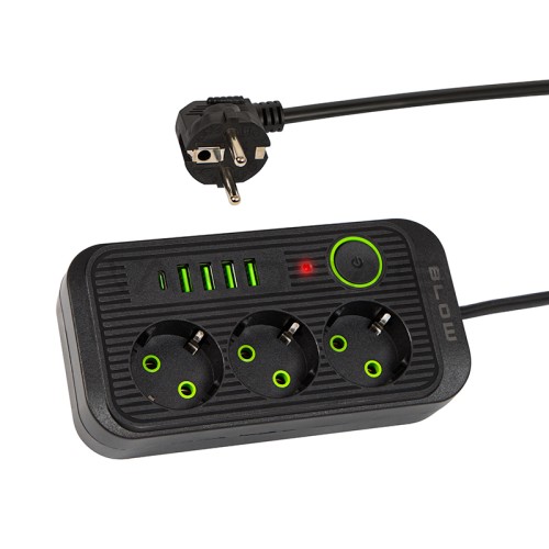 PS-350U 3-Socket Power Extension Cord 4xUSB 1xUSB-C 5m Black 2x1mm
