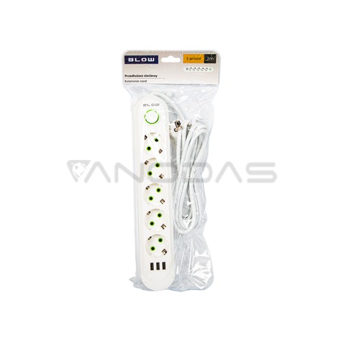 BLOW white extension cord with five sockets designed for home use. The extension cord allows you to connect devices that are far from the electrical socket. The product has 5 angled sockets and a switch on one side, and a single angled mains plug on the other.