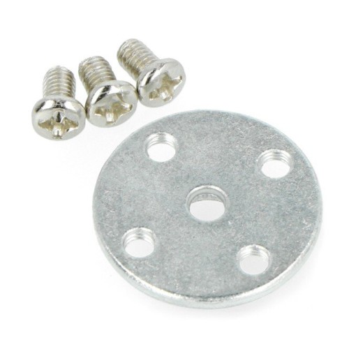 Aluminum servo horn with a diameter of 20 mm and a mounting hole of 6 mm. It has a round shape. Compatible with standard servos. The set also includes mounting screws.