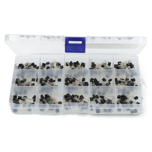 A set of NPN and PNP bipolar transistors, including 15 different types, 20 pieces each. The set contains a total of 300 transistors. All components are housed in a practical transparent organizer that facilitates storage, quick access to selected models, and helps maintain a tidy workstation.