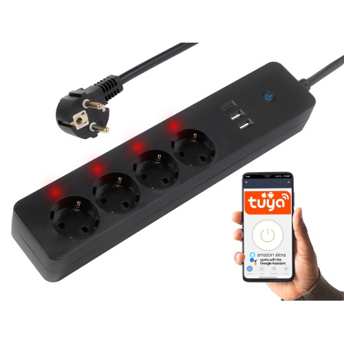 Smart power strip BLACK 1.5m 2xUSB+USB-C WiFi TUYA