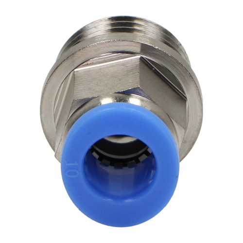 Pneumatic push-in connector, dedicated to professional applications in pneumatic systems. It has a 1/2" connection thread, enabling easy connection to 10 mm diameter pipes made of PU, PA, PE. Made of durable PBT material, the connector is lightweight and resistant to various environmental conditions. The connector supports compressed air and vacuum, providing a wide range of working pressure from -0.95 to 15 bar. At working temperatures from -20°C to +70°C, the connector guarantees reliability and durability in various working conditions. Easy assembly and solid connection make this connector an ideal solution for advanced pneumatic applications.