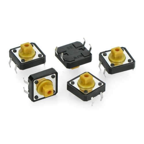 A small monostable button mounted in a through-hole way - THT with six pins with the size: 12x12 mm, height: 7 mm. The button is in the form of a square, in the yellow color. 10 pcs.