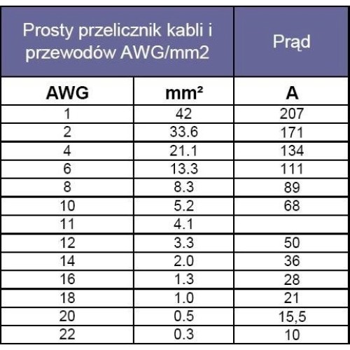 - The design of the connectors allows the use of wires with a cross-section of 16-20 AWG (from 0.5 to 1.3 mm2) - AWG table.