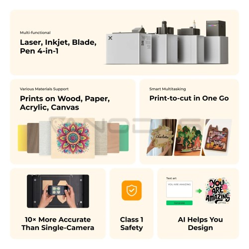 Equipped with four distinct functions laser, inkjet, blade, and pen the xTool M1 Ultra is built for a variety of crafting applications, supporting materials such as wood, paper, acrylic, and canvas. Its smart multitasking capabilities allow you to switch between printing and cutting in one seamless operation, making crafting more efficient than ever. With Artimund AI, you can design with ease in seconds, and the snapshot preview feature provides instant accuracy with 10x precision for perfect results every time.