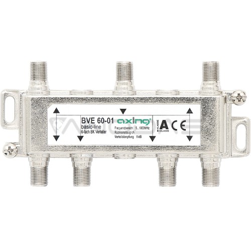 Šveicarijos prekės ženklo „Axing“ skirstytuvas su „F“ lizdais, skirtas padalinti antžeminės ir palydovinės televizijos signalus iš vieno šaltinio į šešis. Gamyboje naudojamos aukštos kokybės medžiagos užtikrina naudojimo saugumą ir apsaugą nuo įvairių pažeidimų. Prietaisas taip pat pasižymi gerais techniniais parametrais, dėmesiu detalėms ir itin paprastu surinkimu.
