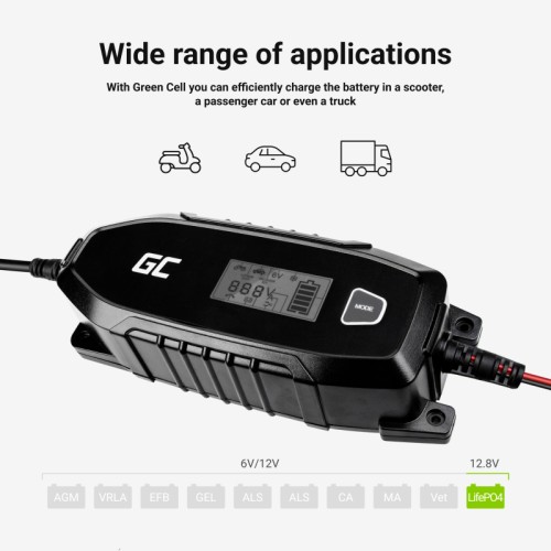Green Cell automatinis įkroviklis skirtas 6V ir 12V baterijų įkrovimui. Jis užtikrina greitą, saugų ir efektyvų įvairių tipų elementų įkrovimą, įskaitant AGM, EFB, MF, SLA, VRLA, Wet, gelio, švino rūgšties ir LiFePO4. Tai puikus pasirinkimas įvairioms transporto priemonėms ir įrangai, pavyzdžiui, motociklams, automobiliams, motoroleriams ir keturračiams. 4A srovė užtikrina efektyvų iki 120 Ah talpos akumuliatorių įkrovimą. Vienas iš pagrindinių įkroviklio elementų – išmanioji diagnostikos funkcija, kuri automatiškai stebi elemento būklę ir pritaiko įkrovimo procesą pagal jos poreikius. Tai leidžia pratęsti baterijos veikimo laiką. Green Cell įkroviklis aprūpintas daugybe apsaugos priemonių, įskaitant apsaugą nuo trumpojo jungimo, perkaitimo, perkrovimo ir atvirkštinio poliškumo. Dėl to galite būti tikri, kad akumuliatorius įkraunamas saugiai. Tvirtas korpusas, atitinkantis IP65 standartą, užtikrina visišką apsaugą nuo dulkių ir purslų.