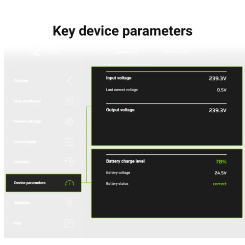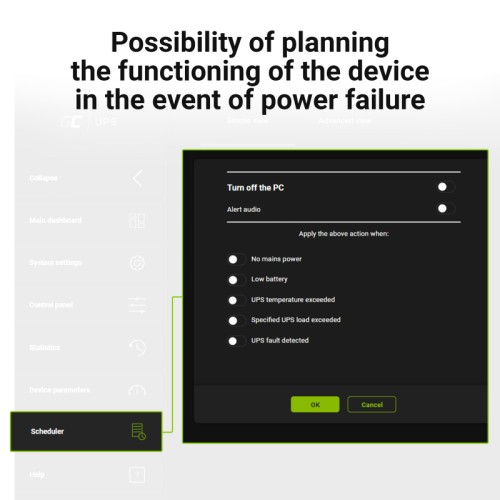 - Kad būtų galima naudotis „Green Cell“ UPS funkcijomis, sukurta speciali programinė įranga, leidžianti pažangiai valdyti įrenginį. Programa užtikrina paprastą ir intuityvų naudojimą be jokių problemų. Programa leidžia peržiūrėti realiuoju laiku ir rodo matavimo duomenis, įskaitant įėjimo ir išėjimo įtampą, UPS apkrovos dažnį, jo temperatūrą ir akumuliatoriaus talpą. Galite nustatyti automatinį sistemos išjungimą, pranešimus ir el. pašto įspėjimus.
