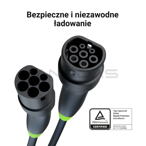 Green Cell Snap Type 2 elektromobilių įkrovimo laidas, 22 kW, 7 m, skirtas Tesla Model 3 SXY, VW ID.3, ID.4, Kia EV6, Hyundai IONIQ 5, Ford Mach-E