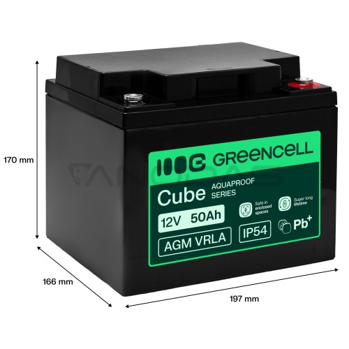 Greencell AGM VRLA 12 V 50 Ah nereikalaujantis priežiūros akumuliatorius UPS, svarstyklėms, kemperiams (197 x 166 x 170 mm)