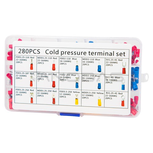 280 izoliuotų gnybtų jungčių rinkinys. Rinkinyje yra 15 rūšių jungčių, surūšiuotų į atskirus skyrius. Patogus, kompaktiškas dėklas su skyreliais neleidžia supainioti jungčių. Visi korpuso skyriai yra pažymėti etiketėmis, todėl lengviau rasti tinkamą jungtį. Jungtys apsaugo nuo pernelyg didelio laidų lenkimo ir jų korozijos bei užtikrina gerą izoliaciją.