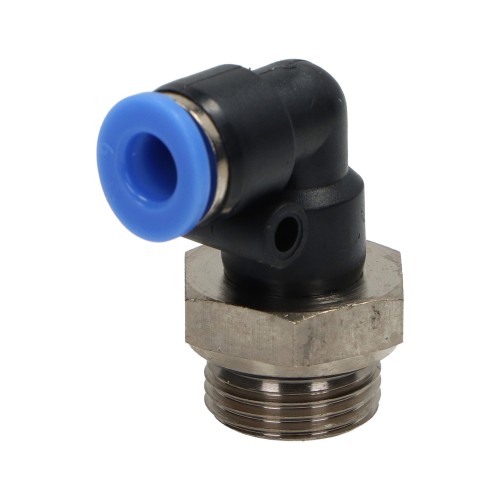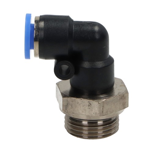 Kampinė pneumatinė kištukinė jungtis žarnai, fi 6 mm, G 3/8 M, plastikinė