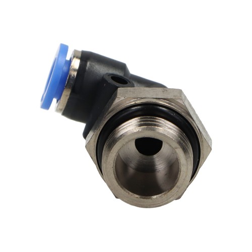 Kampinė pneumatinė jungtis, skirta 6 mm skersmens vamzdžiams, aprūpinta 3/8" sriegiu. PBT ir nikeliuoto žalvario konstrukcija užtikrina tvirtumą ir cheminį atsparumą. Jungtis skirta perduoti suspaustą orą arba vakuumą darbinio slėgio diapazone nuo -0,95 iki 15 bar Puikiai tinka prijungti PU, PA, PE kabelius, veikiančius temperatūros diapazone nuo -20°C iki +70°C.