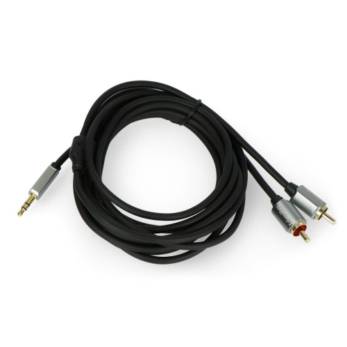 Aukštos kokybės juodas Kruger&Matz kabelis. Vienoje jos pusėje yra 3.5mm kištukas, kitoje - du RCA kištukai. Kabelis naudojamas garso signalams, pvz. garsui perduoti tarp išmaniojo telefono ar kompiuterio ir stiprintuvo. Kabelis yra 3m ilgio.