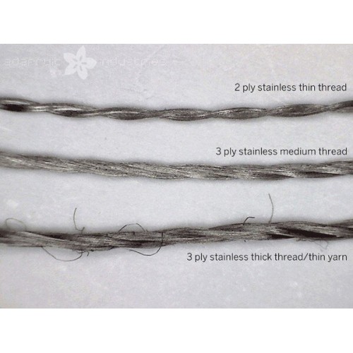 Plonas, tvirtas ir lygus laidus siūlas iš nerūdijančio plieno 316L. Gaminys leidžia siūti rankomis ir mašinomis. Siūlas turi mažą atsparumą - apie 0,8 Ω colyje, jis praleidžia iki 100 mA srovę. Į kainą įskaičiuota ritė, kurios ilgis 18 metrų.
