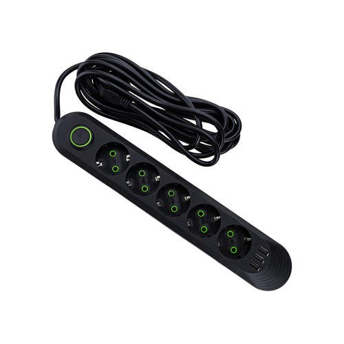 Maitinimo blokas turi penkis 220–240 V lizdus, leidžiančius vienu metu prijungti kelis įrenginius, tokius kaip kompiuteriai, televizoriai, įkrovikliai ir kt. Lizdų maksimali apkrova yra 2500 W / 10 A, o tai reiškia, kad galite saugiai prijungti įrenginius, kuriems reikia didesnio energijos kiekio. Be to, ilgintuvas turi tris 5 V USB prievadus. Tai puikus sprendimas išmaniesiems telefonams, planšetiniams kompiuteriams ir kitiems USB įrenginiams įkrauti. Dėl apsaugos sistemos jūsų įrenginiai bus įkraunami stabiliai ir saugiai.