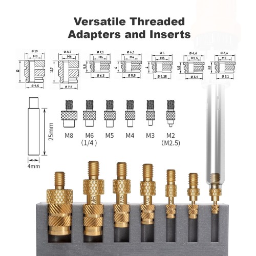 Šis „Mintion“ rinkinys yra specialiai sukurtas gamintojams, norintiems sustiprinti savo 3D spausdintus komponentus. Rinkinyje yra maždaug 77 dalys – adapteris, šešių dydžių antgaliai ir 70 septynių dydžių srieginių žalvarinių įdėklų – todėl jis yra universalus ir tinka įvairiems pritaikymams.