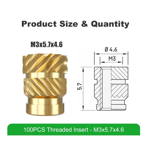 „Mintion“ M3 x 5,7 mm x 4,6 mm srieginių įdėklų rinkinys skirtas 3D spausdintoms detalėms, kurioms reikalingos tvirtos, kartojamos varžtinės jungtys. Ši pakuotė, kurioje yra 100 vienetų vieno įprasto dydžio, idealiai tinka projektams, kuriuose labai reikalingos M3 tvirtinimo detalės, arba kaip esamų įdėklų rinkinių papildymas.