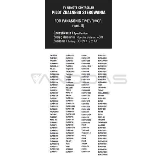 Svarbiausios savybės: Universalus – tinka daugumai PANASONIC televizorių, VCR ir DVR modelių Aukštas funkcionalumas – kaip ir originalūs nuotolinio valdymo pultai Puiki kokybė – gamybos procese buvo naudojamos aukščiausios kokybės medžiagos Paprastas ir intuityvus valdymas Didelis mygtukų skaičius, leidžiantis valdyti daugelį TV funkcijos Atsparūs dilimui mygtukai Patogus laikyti – nėra aštrių briaunų