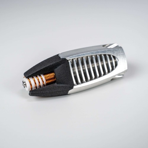 Naudodami indukciją galime tiesiogiai šildyti patį antgalį, o tai reiškia, kad mums nebereikia šildytuvo bloko. Tai sumažina šiluminę masę, kurią reikia šildyti, todėl mažiau energijos švaistoma dėl šilumos spinduliuotės, todėl ji yra ypač efektyvi. Dėl naujoviško dizaino temperatūros jutiklį pavyko pritvirtinti tiesiai ant antgalio. Taip akimirksniu sužinome, koks karštas mūsų siūlas, o naudodami indukciją galime reaguoti greičiau, neviršydami tikslinės temperatūros. Suteikia mums tikslią temperatūros kontrolę ir tobulą ekstruziją.