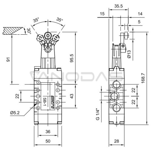 Pneumatinis vožtuvas 5/2 SB1 mechaniškai valdomas 1/4