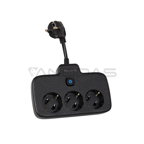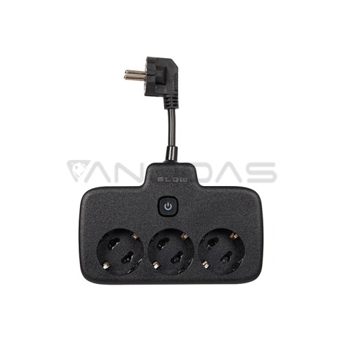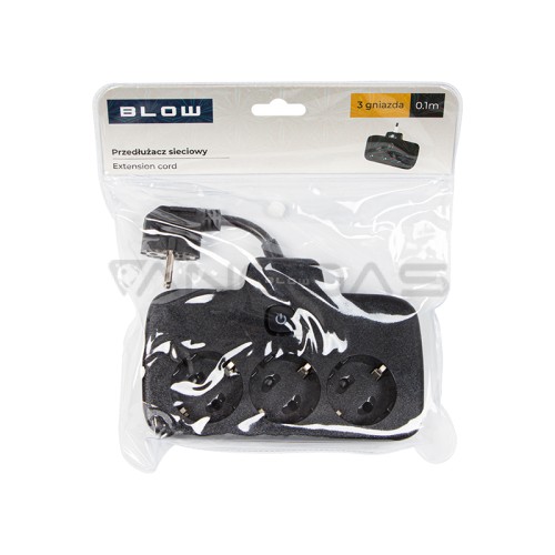Juodas BLOW maitinimo ilgintuvas su trimis lizdais, skirtas naudojimui namuose. Prailginimo laidas leidžia prijungti įrenginius, kurie yra toli nuo elektros lizdo. Vienoje gaminio pusėje yra trys kampiniai lizdai ir jungiklis, o kitoje - vienas kampinis maitinimo kištukas.