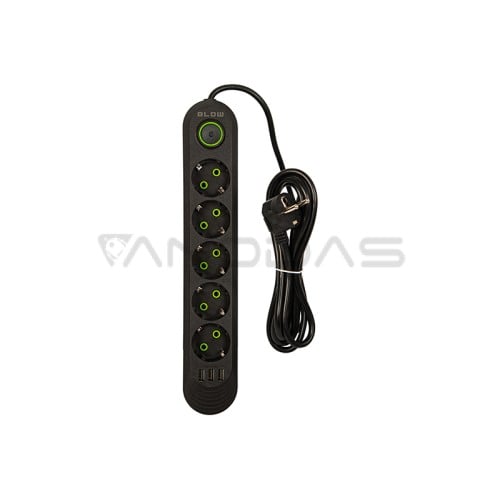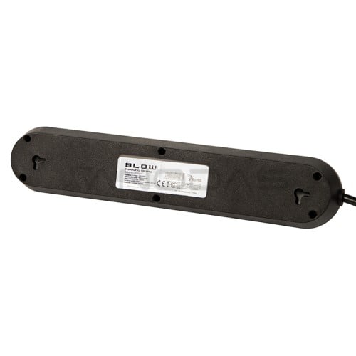 BLOW maitinimo ilgintuvas juodos spalvos su penkiais lizdais, skirtas naudojimui namuose. Prailginimo laidas leidžia prijungti įrenginius, kurie yra toli nuo elektros lizdo. Vienoje gaminio pusėje yra 5 kampu pasukti kištukiniai lizdai ir jungiklis, o kitoje – vienas kampuotas maitinimo kištukas.